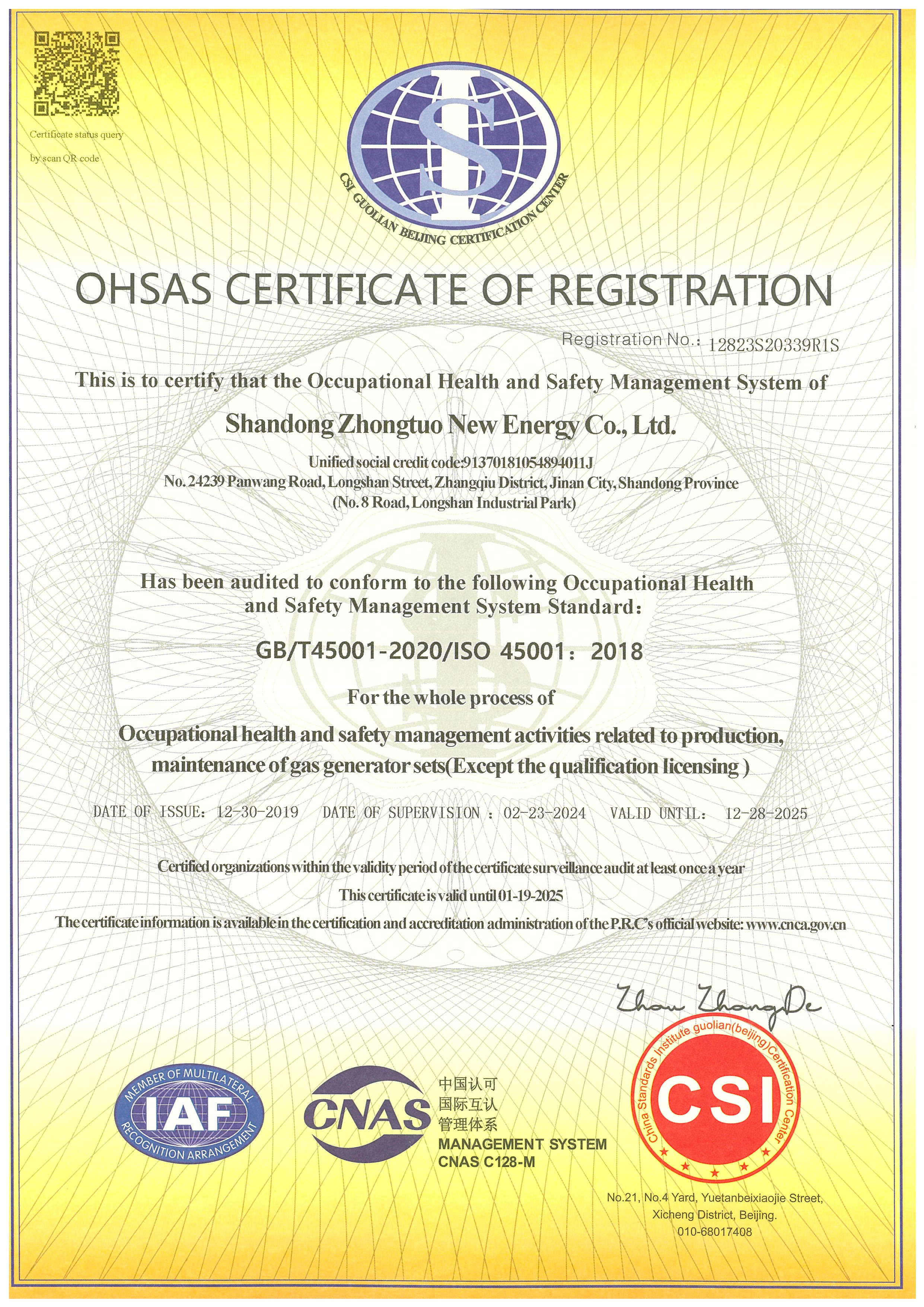 職業健康安全管理體系認證證書